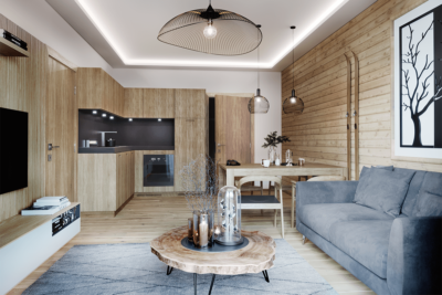 Moderní apartmán je kompletně zařízený, vybavený kuchyní a koupelnou s vanou.