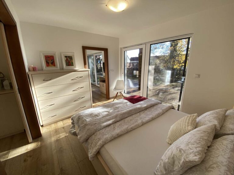 Z obývacího pokoje i z ložnice máte vstup přímo na terasu s krásným výhledem na vzrostlé starobylé duby, které lemují Mlýnskou stoku.